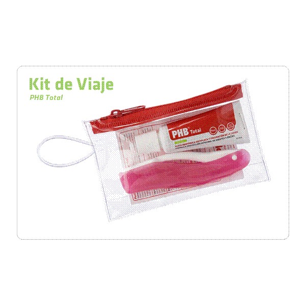Kit de viaje que contiene; cepillo dental con cabezal redondeado y pequeño tamaño, fabricado con filamentos de Tynex y pasta dental TOTAL de pHB, con acción frente la caries, acción antiplaca, acción antisarro, proporciona protección a las encías y combate el mal aliento.